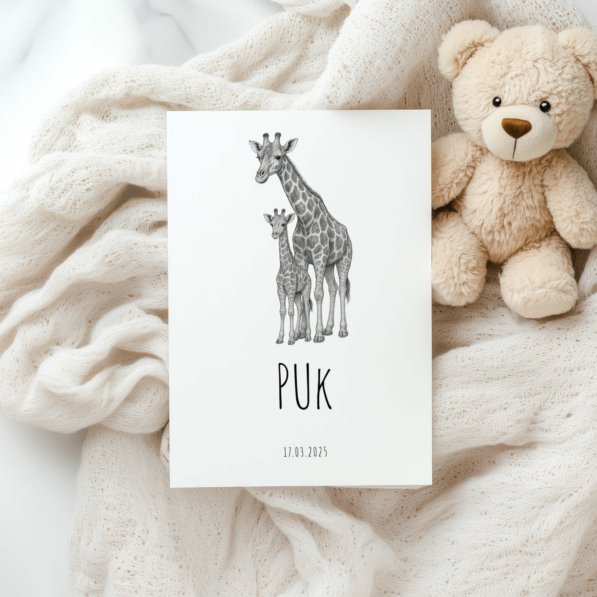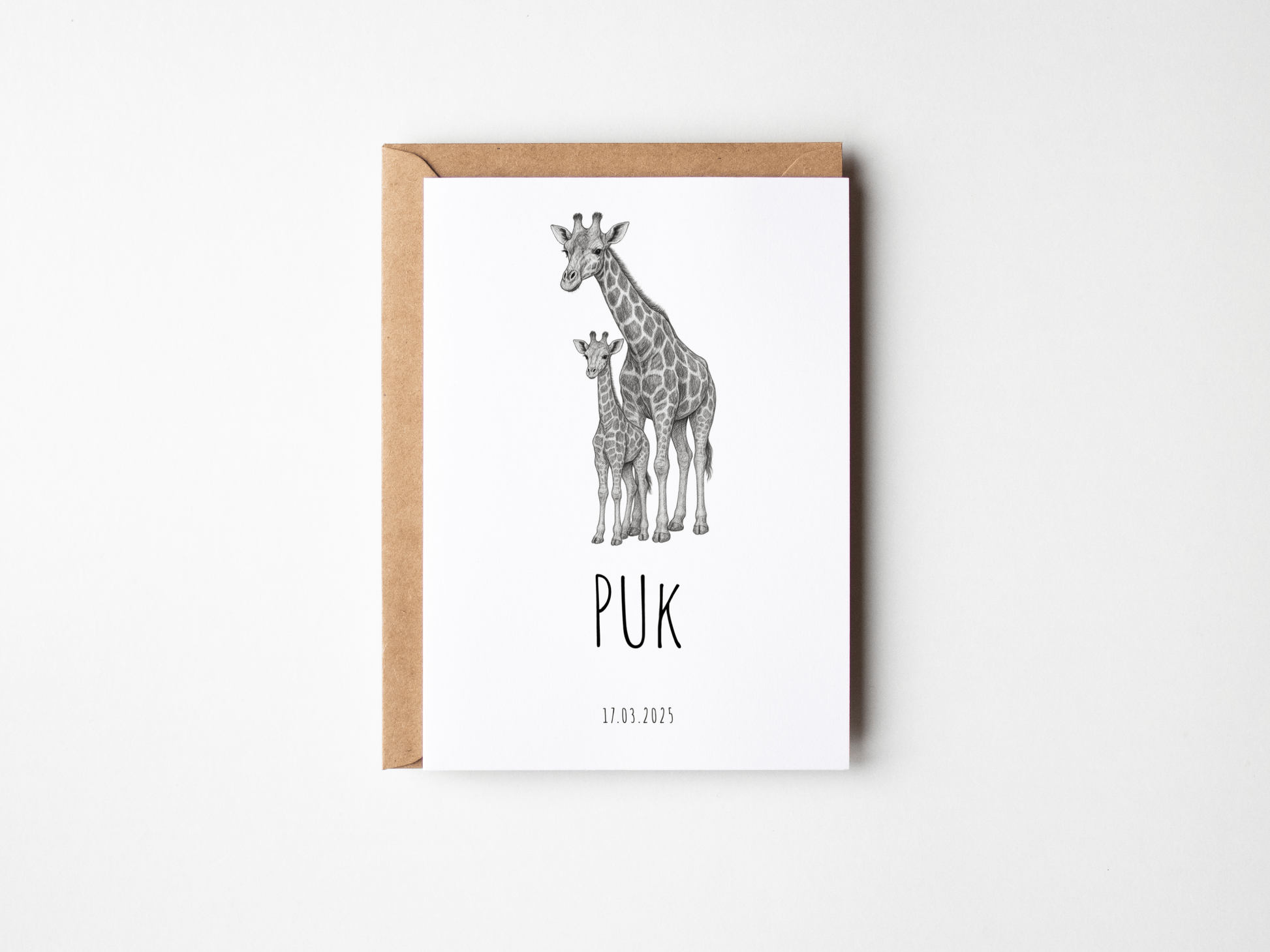Dit geboortekaartje combineert een lieve voorzijde met een realistische potloodtekening van een giraffe en kalfje met een strakke, minimalistische achterkant voor een helder overzicht van alle geboorte-informatie.