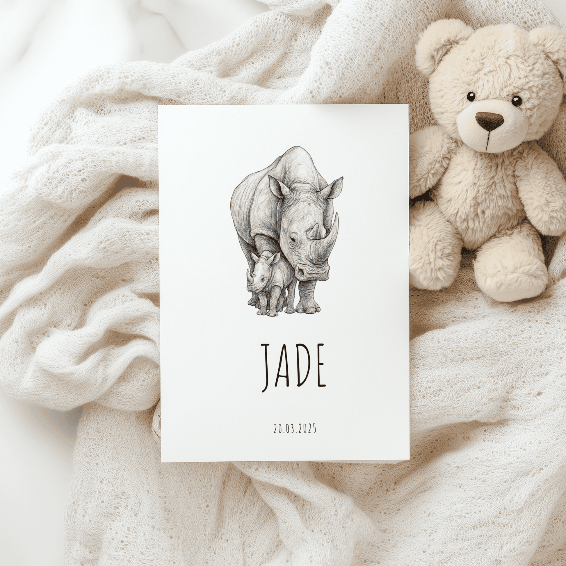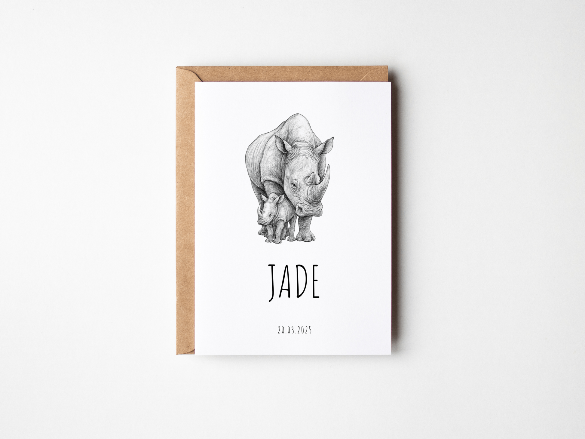 Dit geboortekaartje combineert een stoere, lieve voorzijde met een realistische potloodtekening van een neushoorn en kalfje met een strakke, minimalistische achterkant voor een helder overzicht van alle geboorte-informatie.
