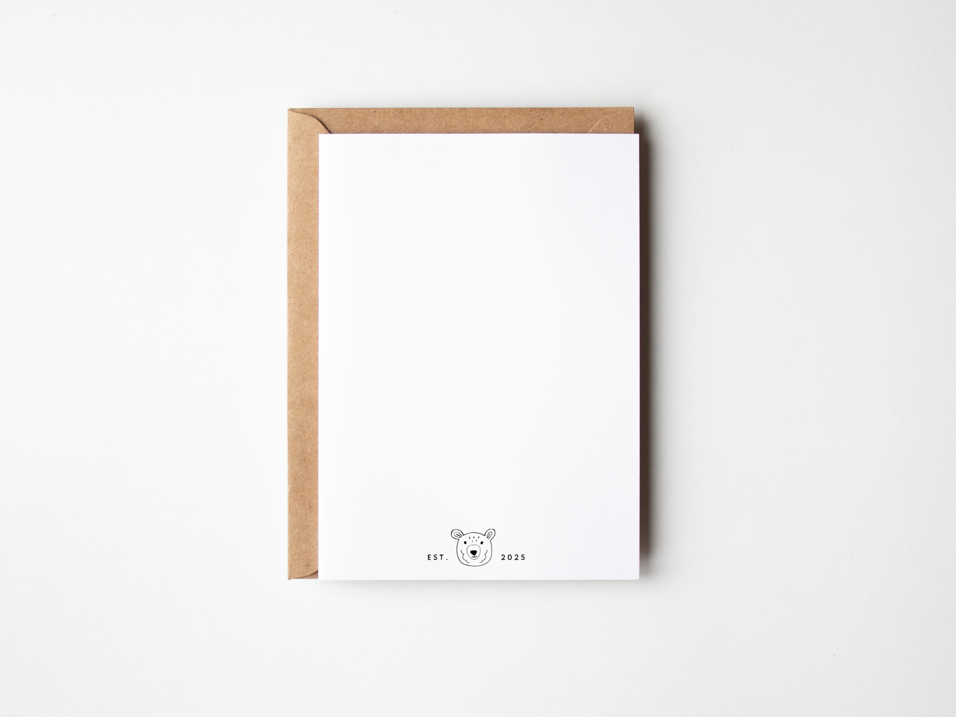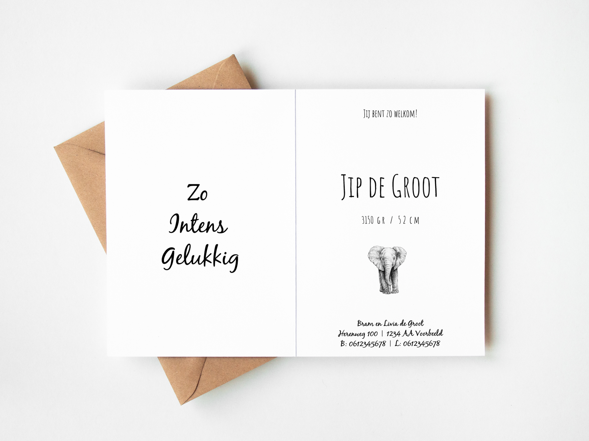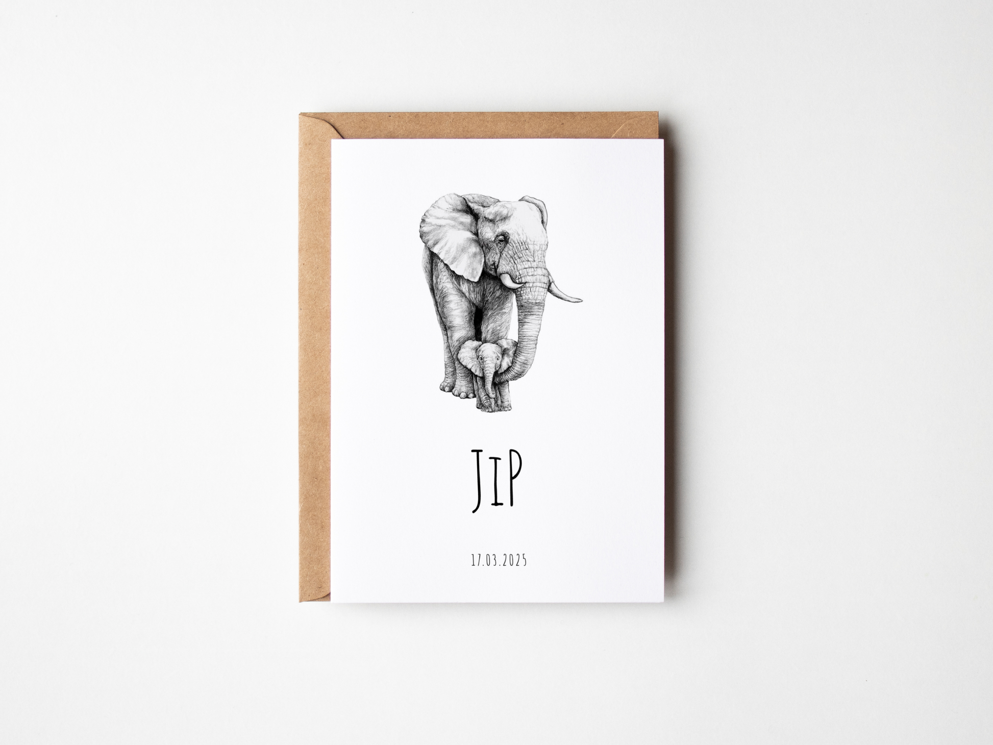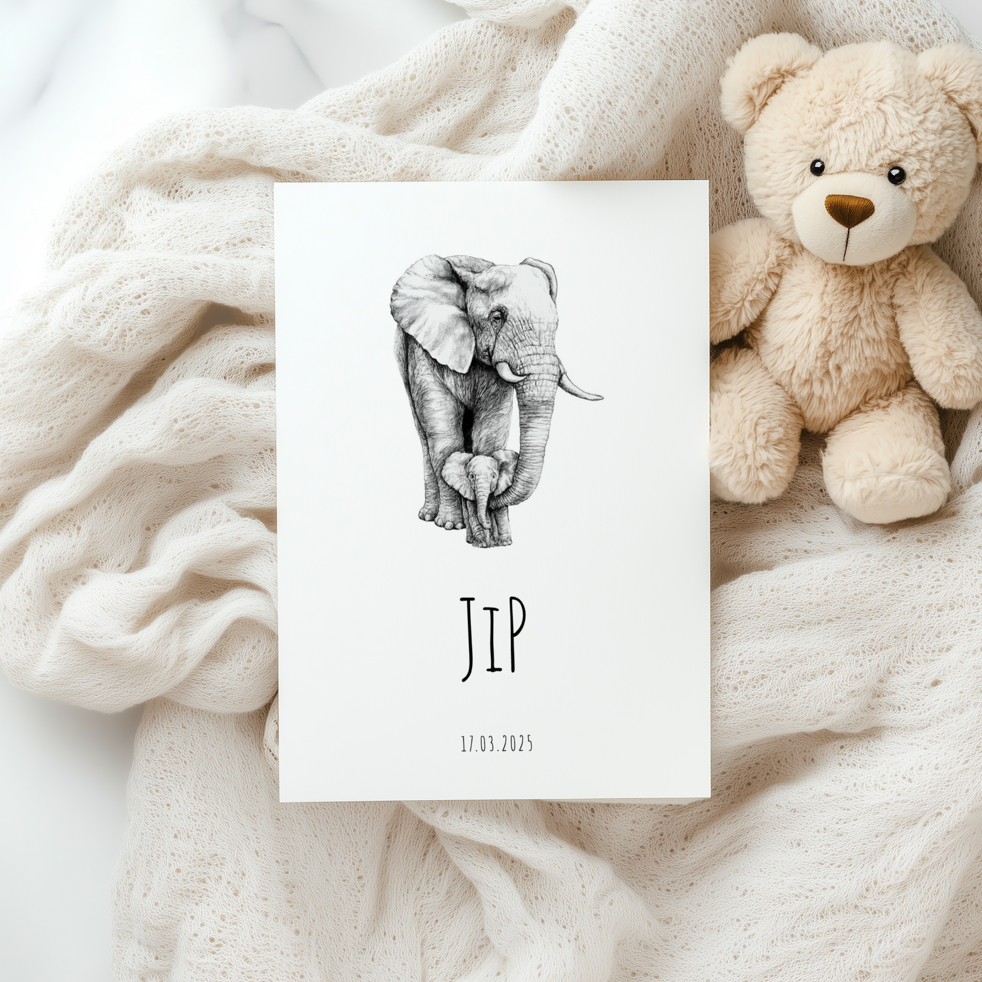 Dit geboortekaartje combineert een lieve voorzijde met een realistische potloodtekening van een olifant en kalfje met een strakke, minimalistische achterkant voor een helder overzicht van alle geboorte-informatie.
